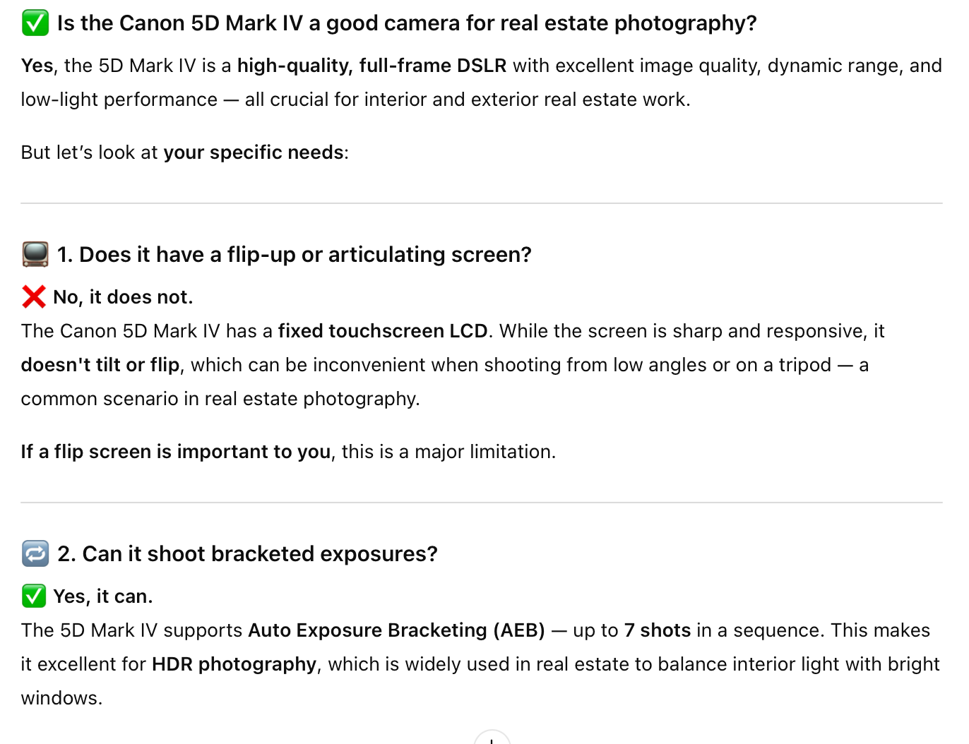 “Im getting into real estate photography and I’m thinking about getting the canon 5d mark iv, is this a good camera for real estate photography? I want a screen that flips up and need it to shoot bracketing shots”